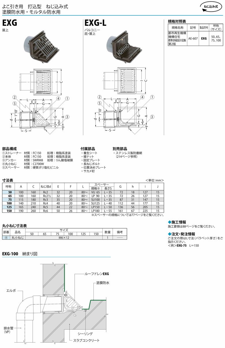 - 塗膜・モルタル防水用、横引き、ねじ込のコーナードレインの情報ページです。EXG、EXGLの製品情報、取扱説明、価格の案内です。